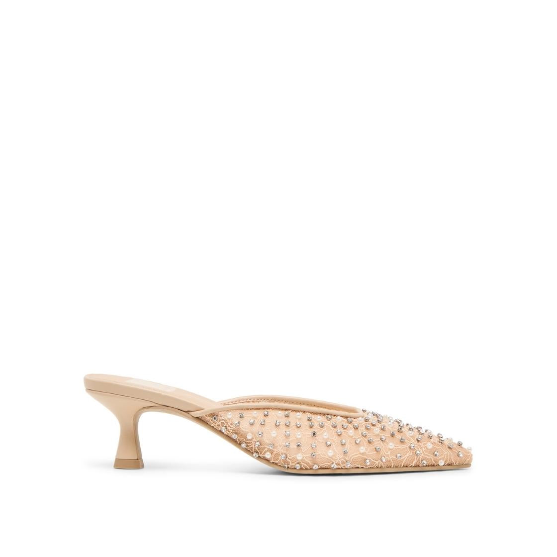 Cleo combina lo atemporal con detalles modernos. Esta mule de tacón destaca por sus aplicaciones de perlas sobre una malla ligera, creando un look llamativo y sofisticado.